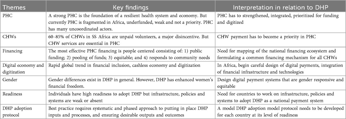 Table 7 presents a synthesis of key findings from literature and its interpretation in relation to DHPs. DHP was mentioned under five themes: primary health care (PHC), CHWs, health financing, digital economy, gender and digital payments, readiness for DHP and DHP systems/protocols.