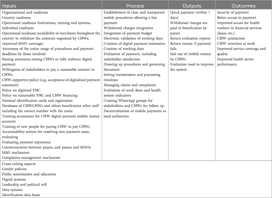 In designing a protocol for DHP adoption and implementation, we considered inputs from DHP readiness assessment, which are: infrastructure, institutions, training and systems. We also considered DHP establishment and operational processes of the payment system. Finally, we considered DHP outputs of immediate results from process activities, and outcomes as the desired results. The outcomes considered included security and safety of payment, CHW satisfaction and retention, health care coverage and improvement. Cross-cutting elements of the prototype include gender, leadership, policy and public awareness. See Table 8.