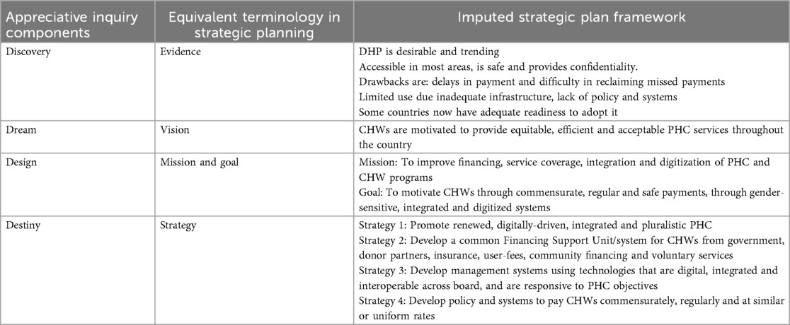 Based on Appreciative Inquiry's 4Ds (Discovery, Dream, Design and Destiny) an equivalent framework (consisting of Vision, Mission, Goals, and Strategies in the planning terminology) was imputed. A DHP adoption strategy is in Table 9. There is evidence that DHP is desirable and a trending phenomenon. The mission is to improve CHW financing and motivation to revitalize PHC towards universal health coverage. The goal is to set up a system that is digitized, integrated, gender-sensitive and sustainable. The strategies are to digitalize PHC, set up common financing units for CHWs, ensure interoperable technologies across board, and improve CHW pay level and payment system.