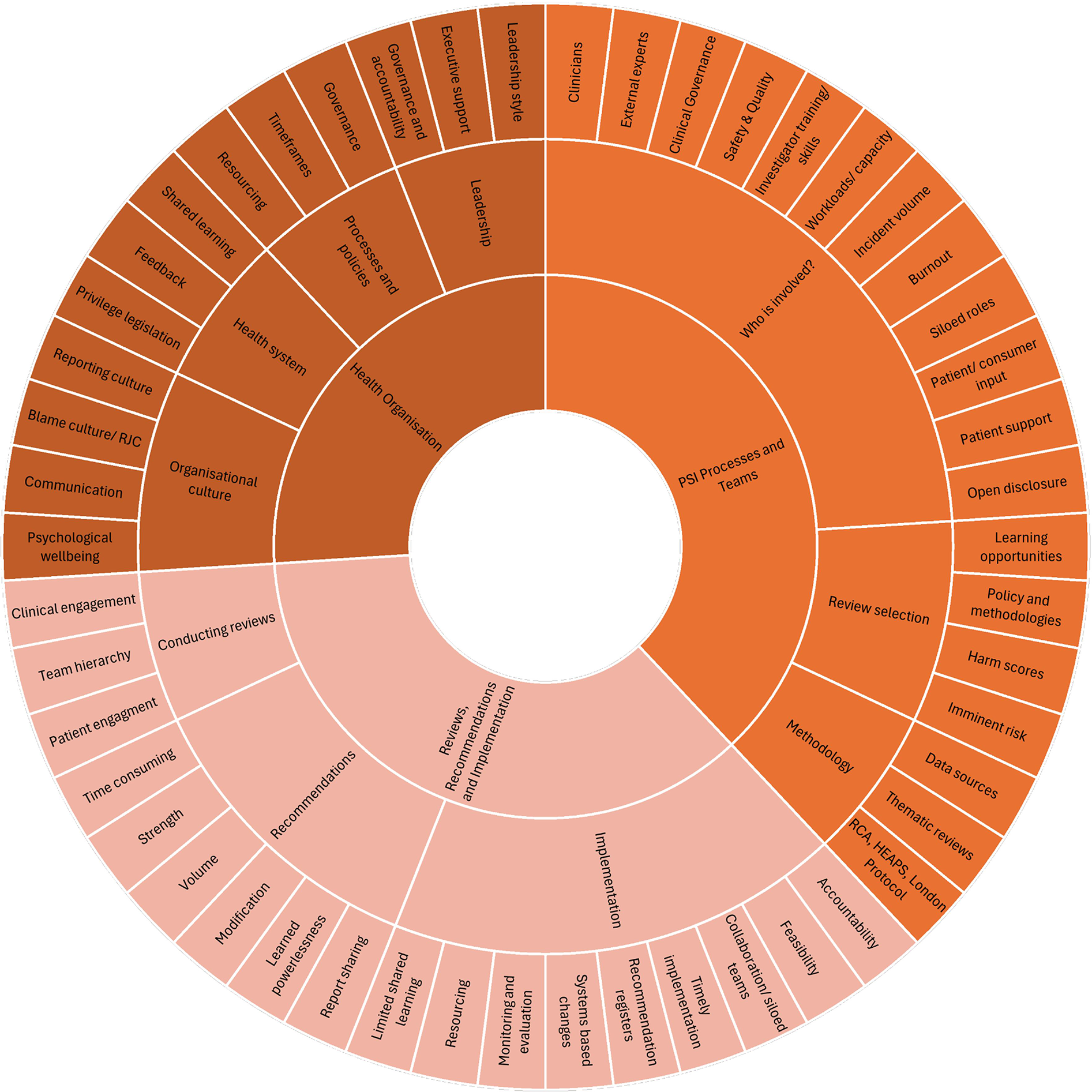 Australian (n = 99) and international (n = 11) participants took part in one of 25 focus groups (n = 78) or 32 interviews. Most participants (n = 99) completed the survey. Nearly all survey participants agreed/strongly agreed that PSI reviews are valuable for improving patient safety (95%), particularly when human factors and contextual influences on performance (76%) are considered. Two-thirds of participants agreed that investigations help prevent PSI recurrence (68%), avoid unfair blame (67%), and support continuous improvement (61%). However, fewer participants felt recommendations are consistently accepted by organisations (58%) or are appropriately targeted within the healthcare system (57%). Key strengths and challenges of the PSI review process were identified across three themes: Selection of PSI Reviews; Reviews, Recommendations and Implementation; and Health Organisations and Wider System Influences. Key PSI review challenges included: limited capacity and engagement, high staff workloads, turnover, and burnout, as well as variable skills, and limited human factors and systems thinking experience across review teams. Despite strong efforts to reduce a punitive culture, resistance to reporting and blame persists across some hospitals. Participants highlighted a learned powerlessness when developing systems thinking-based recommendations, resulting in the development of weaker, less resource intensive recommendations. Limited sharing of learnings and feedback on review findings, and variable monitoring, evaluation and accountability of recommendation implementation were also common challenges.
