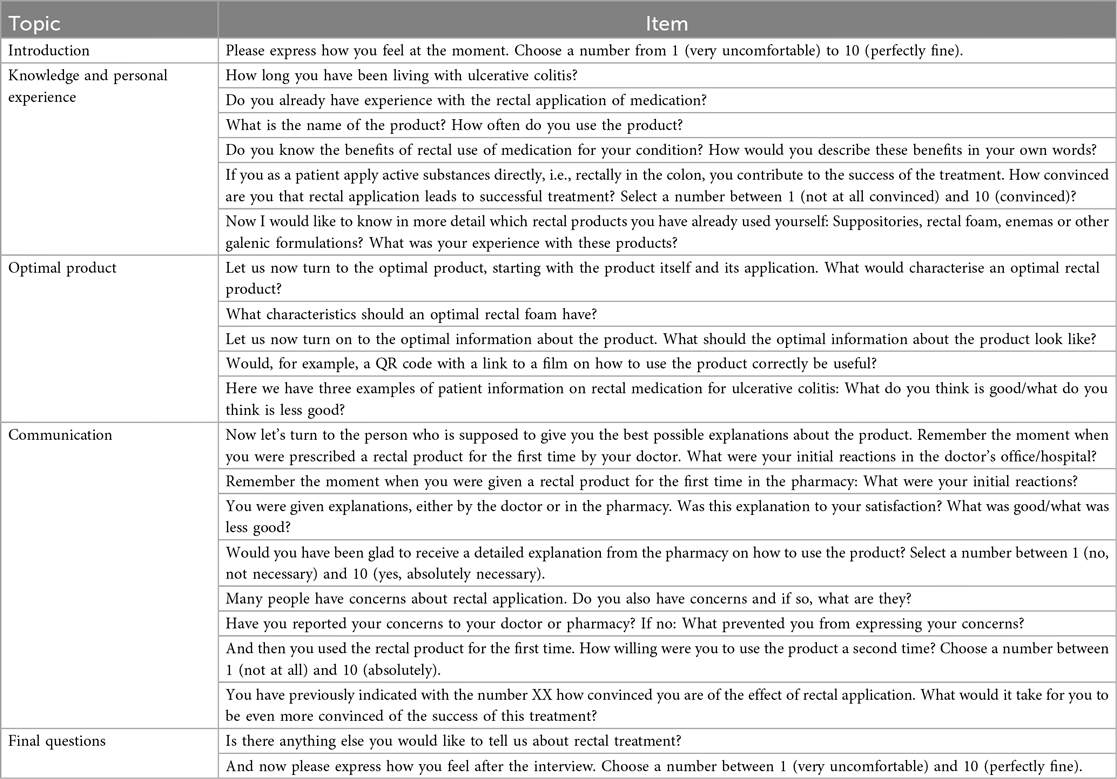 Modifiable factors of non-adherence to rectally applied medicines in IBD-patients were screened in literature and reviewed against personal experience by the authors. Tackling knowledge and beliefs (such as a lack of understanding of the disease and of the drug regimen, fear of side effects, the medication itself (such as inconvenient or complex dosing), product characteristics, and communication (such as shortage of information, lack of belief in HCP's judgement (10, 18) were judged relevant. The interview guide consisted of 3 blocs and nine open-ended questions (see Appendix 1). Each bloc addressed one factor of non-adherence. The interview guide was developed and tested for comprehensibility, first with the investigators (JR, IA) and second with a person with IBD not involved in the study (man, 30 years). Each bloc started with a closed-end question that introduces the topic of the bloc. The interview started and ended with a mood question: “How do you feel at the moment?” with an answer scale from 1 (very uncomfortable) to 10 (absolutely fine). To allow people to report their personal experiences in their own language, the scientific term adherence was not used directly.