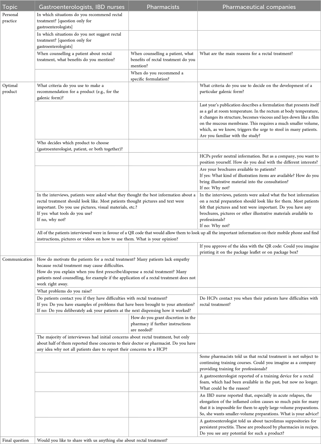 Methods: We recruited people using rectal treatment, community and clinical pharmacists, gastroenterologists, inflammatory bowel diseases (IBD) nurses, and representatives of pharmaceutical companies specialised in the production of rectal therapies. We performed semi-structured one-to-one interviews tackling the three pivotal topics knowledge and beliefs, product characteristics, and communication. We started with patient interviews whose statements served to inform the other interviews. All interviews were the subject of a keyword protocol, audio-recorded, and transcribed. Thematic analysis was used with inductive approach for the patients, and deductive approach for all other interviewees. Identified themes were compared and agreements and divergences were compiled.