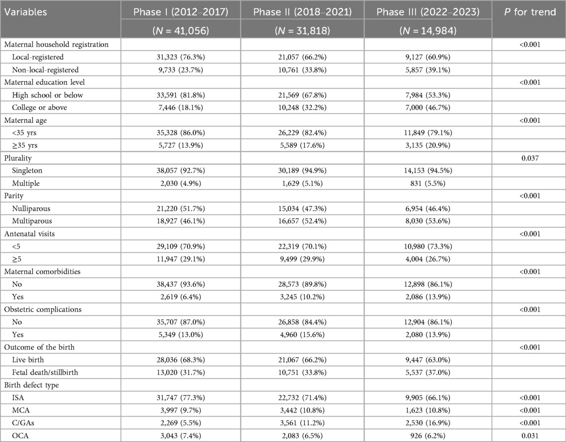 Over time, the sociodemographic profile of mothers changed markedly. The proportion of non-local-registered mothers increased steadily from 23.7% in Phase I to 39.1% in Phase III (P for trend < 0.001). Similarly, the proportion of mothers aged ≥35 years rose from 13.9% to 20.9% (P for trend <0.001), while maternal education levels improved substantially, with college or above rising from 18.1% to 46.7% (P for trend <0.001). Reproductive characteristics also shifted. Multiparous mothers increased from 46.1% to 53.6% (P for trend <0.001), and multiple gestations rose slightly from 4.9% to 5.5% (P = 0.037), although the latter change was small in magnitude. The proportion of women with ≥5 antenatal visits decreased modestly over time (29.1%–26.7%, P for trend <0.001). Regarding maternal health status, comorbidities became more prevalent (6.4%–13.9%, P for trend <0.001), as did obstetric complications (13.0% to 13.9%, P for trend <0.001). Correspondingly, the proportion of fetal deaths or stillbirths increased from 31.7% to 37.0% (P for trend <0.001). The distribution of birth defect types also shifted. Isolated structural anomalies decreased from 77.3% to 66.1% (P for trend <0.001), while chromosomal/genetic anomalies rose markedly from 5.5% to 16.9% (P for trend <0.001). Multiple congenital anomalies also showed a modest but significant increase (9.7% to 10.8%, P for trend <0.001), whereas other congenital anomalies declined slightly (7.4% to 6.2%, P = 0.031).