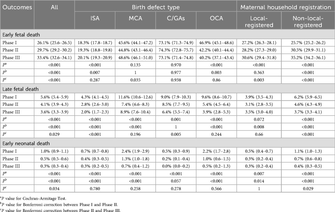 When stratified by defect type, patterns differed. For isolated structural anomalies, early fetal death rose modestly from 18.3% to 20.1%, though the Phase II–III increase was not statistically significant (Pc = 0.287). Late fetal death declined steadily (4.3%–2.0%), and early neonatal death decreased to 0.3%, with no further decline after Phase II. For multiple congenital anomalies, early fetal death increased in Phase III (45.6% to 48.6%, Pc = 0.035), while both late fetal death and early neonatal death decreased, with the sharpest declines occurring in Phase II. For chromosomal/genetic anomalies, early fetal death remained persistently high (≈73%) with no meaningful temporal change, whereas late fetal death declined in Phase III (Pc = 0.005) and early neonatal death showed only a modest decrease.