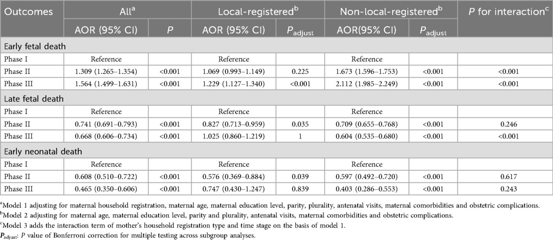 The interaction analyses confirmed that these temporal patterns differed significantly between local and non-local populations for early and late fetal death (P for interaction <0.001), but not for early neonatal death, suggesting that changes in mortality patterns over time were unequally distributed across population subgroups. Stratified analyses revealed heterogeneity by maternal household registration. Among local-registered mothers, the risk of early fetal death rose modestly in Phase III (AOR = 1.23, 95% CI: 1.13–1.34), a small but notable increase that may still carry clinical relevance. Late fetal death showed a transient reduction in Phase II but not in Phase III, while early neonatal death declined in Phase II (AOR = 0.58, 95% CI: 0.37–0.88), corresponding to about a 40% reduction, though the Phase III association was attenuated and no longer significant. In contrast, among non-local-registered mothers, early fetal death increased more sharply across both transitions (Phase II: AOR = 1.67, 95% CI: 1.60–1.75; Phase III: AOR = 2.11, 95% CI: 1.99–2.25). Meanwhile, both late fetal death and early neonatal death consistently declined, with Phase III showing the strongest reductions (late fetal death: AOR = 0.60, 95% CI: 0.54–0.68; early neonatal death: AOR = 0.40, 95% CI: 0.29–0.55).