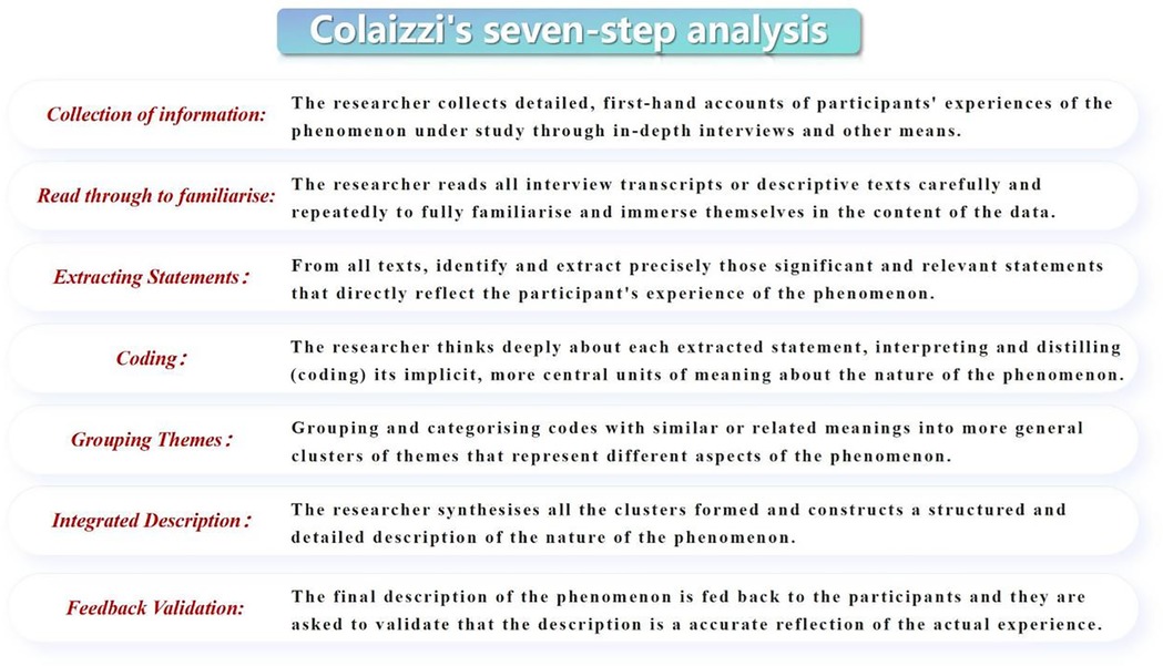 During the design phase, we compared three common qualitative frameworks: Giorgi's descriptive phenomenology, Braun and Clarke's thematic analysis, and constructivist grounded theory. Given that this study focused on the lived experience of nurses in the no-attendant care context and emphasized traceability through participant validation, we ultimately adopted Colaizzi's seven-step method. At the same time, we incorporated systematic organization and “constant comparison” techniques from thematic analysis to enhance interpretive depth and clinical applicability.