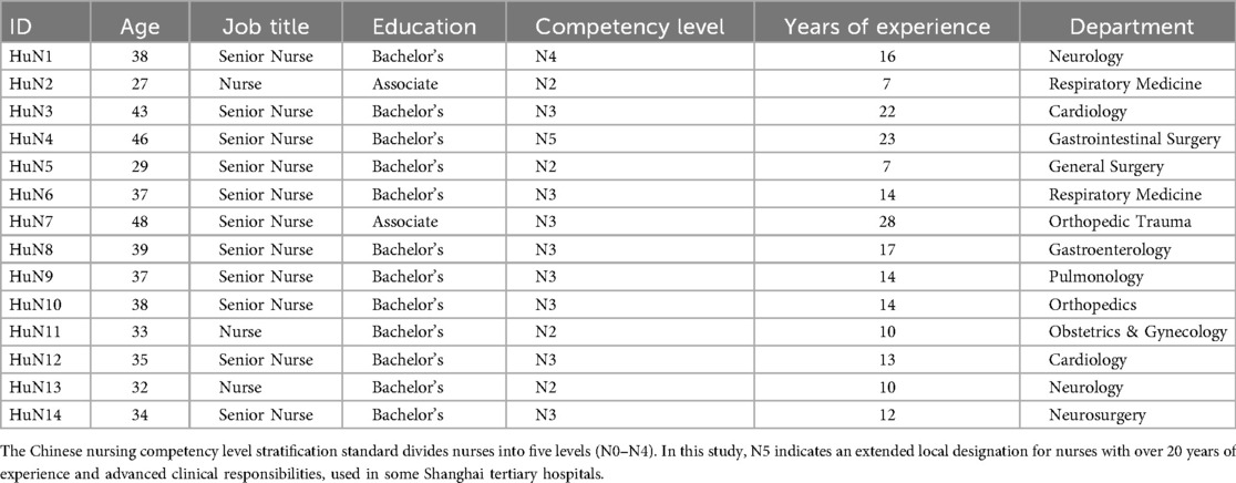 Potential participants were contacted via email or WeChat and invited to join the study. Following the principle of maximum variation, participants were enrolled sequentially until thematic saturation was achieved. In total, 14 nurses were recruited, all of whom provided informed consent and participated fully in the interviews. Basic demographic characteristics of participants are presented in Table 1.