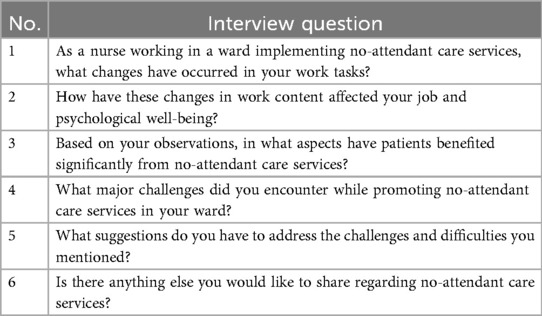 Interviews followed the framework of the guide questions, and researchers asked additional probing questions when necessary. Interviewers were not employed by the study hospitals, minimizing bias or coercion. In addition, two pilot interviews with nurses from no-attendant care wards were conducted to identify potential issues and refine the interview guide; data from pilot interviews were not included in the final analysis. Formal interviews lasted 40–60 min each. All interviews were audio-recorded with participants' consent, and transcripts were produced immediately after each session for coding and analysis.