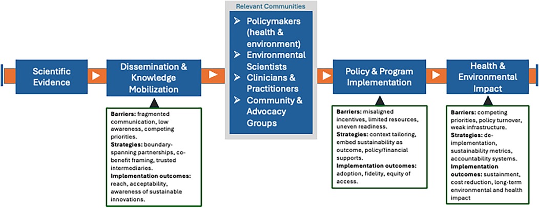 Figure 2. Environmental sustainability dissemination and implementation pipeline model. [Adapted from Farrelly et al. (62)].
