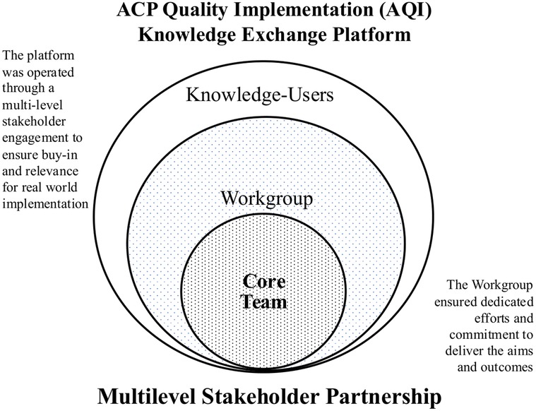A core team comprising 14 representatives from the National ACP Steering Committee (Chairperson), domain experts from AIC, clinicians, researchers, as well as administrators with implementation science knowledge, was formed initially to lead the tasks. Remaining members of the workgroup were sampled from the three healthcare clusters based on their cadre in ACP leadership and implementation roles, as well as professional background (i.e., physicians, nurses), resulting in an additional 14 members joining the Quality Implementation (AQI) Workgroup (21). Figure 1 shows the various stakeholder groups involved as part of the knowledge exchange platform.
