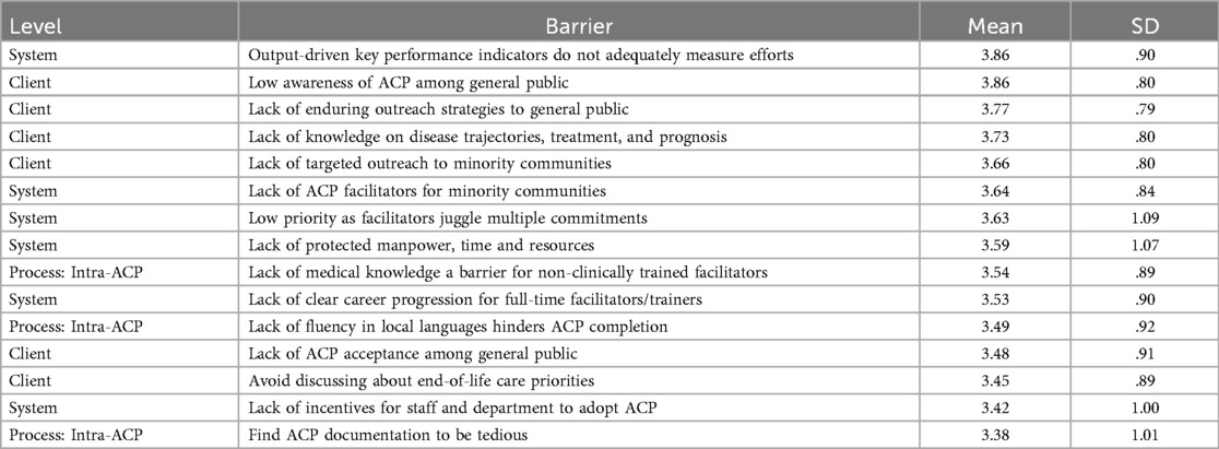 The top 25% of barriers prioritized by the ACP implementers spanned across system, client, and intra-ACP process levels. System and client level barriers made up 80% of the list, while the remaining 20% were intra-ACP process-related barriers, signaling issues with overall resource allocation in ACP implementation, as well as challenges with engaging a wider target ACP audience. Table 1 shows the top barriers experienced by the implementers. Supplementary Table S3 shows results of the remaining barriers by levels.