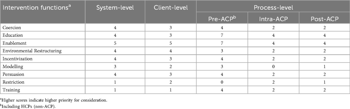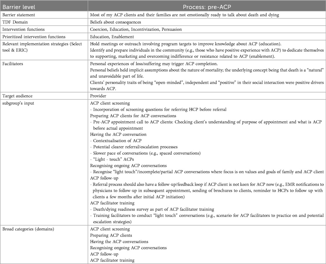 Due to the numerous barriers, we adapted a step in the Select Tool (42) to sort and prioritize the intervention functions by group (system-, client-, and process-related barriers), with higher scores indicating higher priorities for implementation. For example, for the intra-ACP process level barriers, intervention functions such as Education and Enablement had the highest occurrences, which signaled the need to adopt related implementation strategies. Table 2 shows the prioritized intervention functions in each level of the barriers with our adaptation. Next, relevant implementation strategies in the Select Tool and the Expert Recommendations for Implementing Change (ERIC) project (43), and the extracted facilitators in the earlier process, were compiled and shared with the workgroup via email. The facilitators were meant to provide a reference on what worked in some local contexts. To provide a full picture for the workgroup, all barriers differentiated by prioritized categories (Top 25%, mean ≥ 3, and mean < 3) were presented with respective intervention functions and implementation strategies.