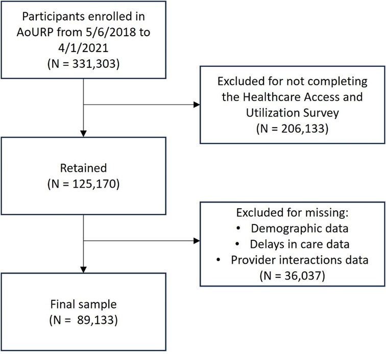 Data used in this study were collected from May 6, 2018, to April 1, 2021. During this period, 331,303 participants were enrolled in AoURP. The initial sample for this study included 125,170 adults (≥18 years) who completed AoURP's Healthcare Access and Utilization survey. Of these, 36,037 (28.8%) participants were excluded because they were missing demographic information used in the study and/or did not complete or responded “Don’t Know” to any of the questions on healthcare provider interactions or delays in care (Figure 1).