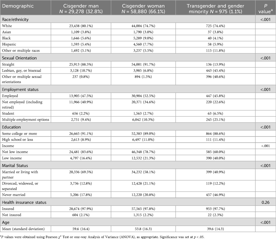 The final sample of 89,133 was 32.8% cisgender men, 66.1% cisgender women, and 1.1% TGD individuals (Table 1). Participants' mean age was 55.6 (standard deviation 16.6), 23.5% reported non-White race/ethnicity, and 97.8% had health insurance.