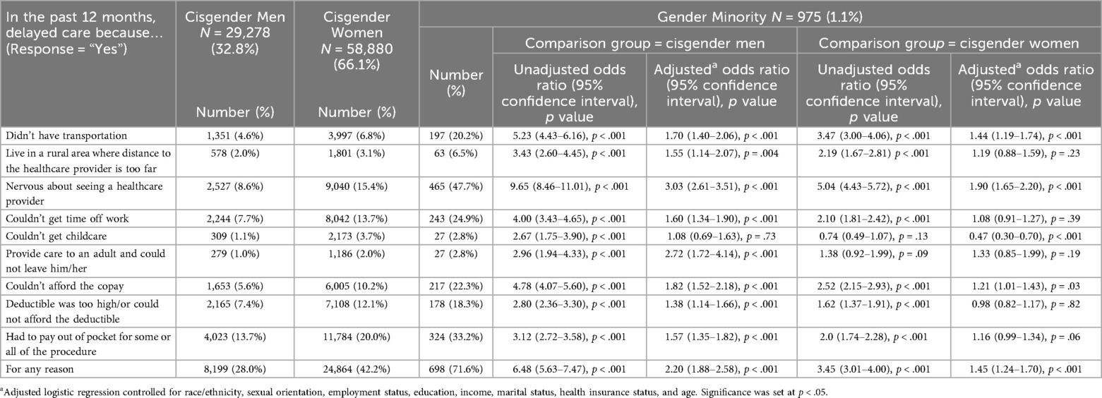 After adjusting for all variables, TGD participants were more likely than cisgender women to report delaying care because they didn't have access to transportation (OR: 1.44, 95% CI: 1.19–1.74) and because they were nervous about seeing a healthcare provider (OR: 1.90, 95% CI: 1.65–2.20). TGD participants were less likely than cisgender women to report delaying care because they couldn't get childcare (OR: 0.74, 95% CI: 0.30–0.70). TGD individuals were more likely than cisgender women to report delaying care for any reason (OR: 1.45, 95% CI: 1.24–1.70).