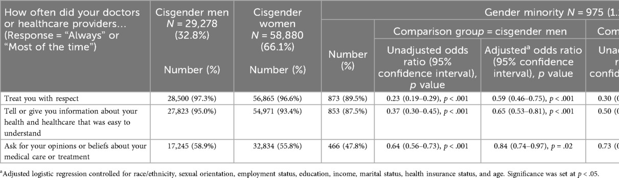 After adjusting for all variables, TGD participants were still less likely than cisgender men to report all three types of positive provider interactions: treated you with respect (OR: 0.59, 95% CI: 0.46–0.75), gave you information that was easy to understand (OR: 0.65, 95% CI: 0.53–0.81), and asked about your opinions or beliefs (OR: 0.84, 95% CI: 0.74–0.97). TGD participants were less likely than cisgender women to report that their healthcare provider treated them with respect (OR: 0.62, 95% CI: 0.49–0.79) and gave them information that was easy to understand (OR: 0.75, 95% CI: 0.61–0.94).