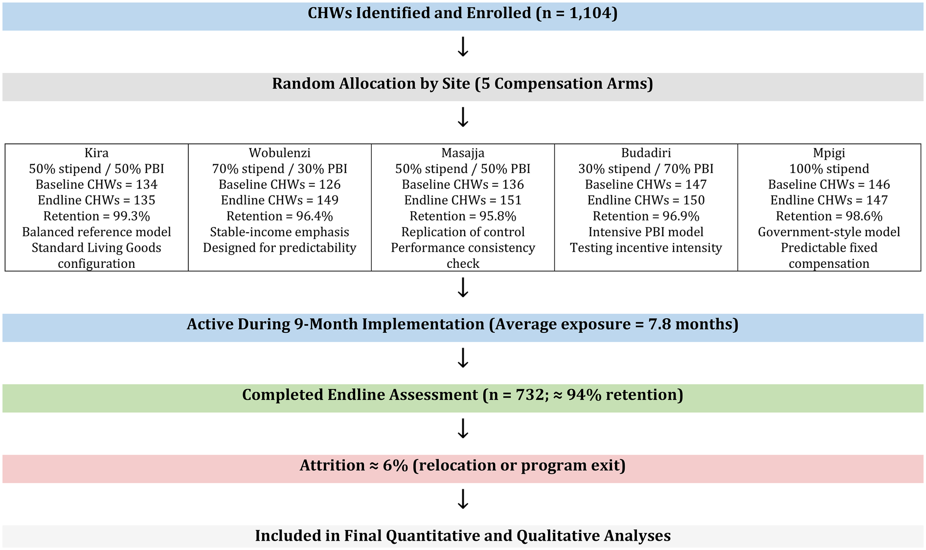 Each compensation arm was piloted in a different site, with baseline and endline assessments conducted to provide robust longitudinal data on participation and performance. In Kira, the control arm tested a balanced model of 50% fixed stipend and 50% performance-based incentives (PBIs), enrolling 134 CHWs at baseline and 135 at endline. Budadiri piloted the high-intensity PBI model in which 70% of income depended on key performance indicators (KPIs) and 30% was a fixed stipend, involving 147 CHWs at baseline and 150 at endline. Masajja implemented an equal split model (50% stipend, 50% KPIs), with 136 CHWs at baseline and 151 at endline. In Mpigi, the stipend-only arm offered a 100% fixed stipend with no performance-based component, enrolling 146 CHWs at baseline and 147 at endline. Finally, Wobulenzi tested the predominantly stipend-based model with 70% fixed stipend and 30% KPIs, engaging 126 CHWs at baseline and 149 at endline. Together, these distributions ensured that the study captured the effects of different compensation structures across varied geographical and operational contexts.