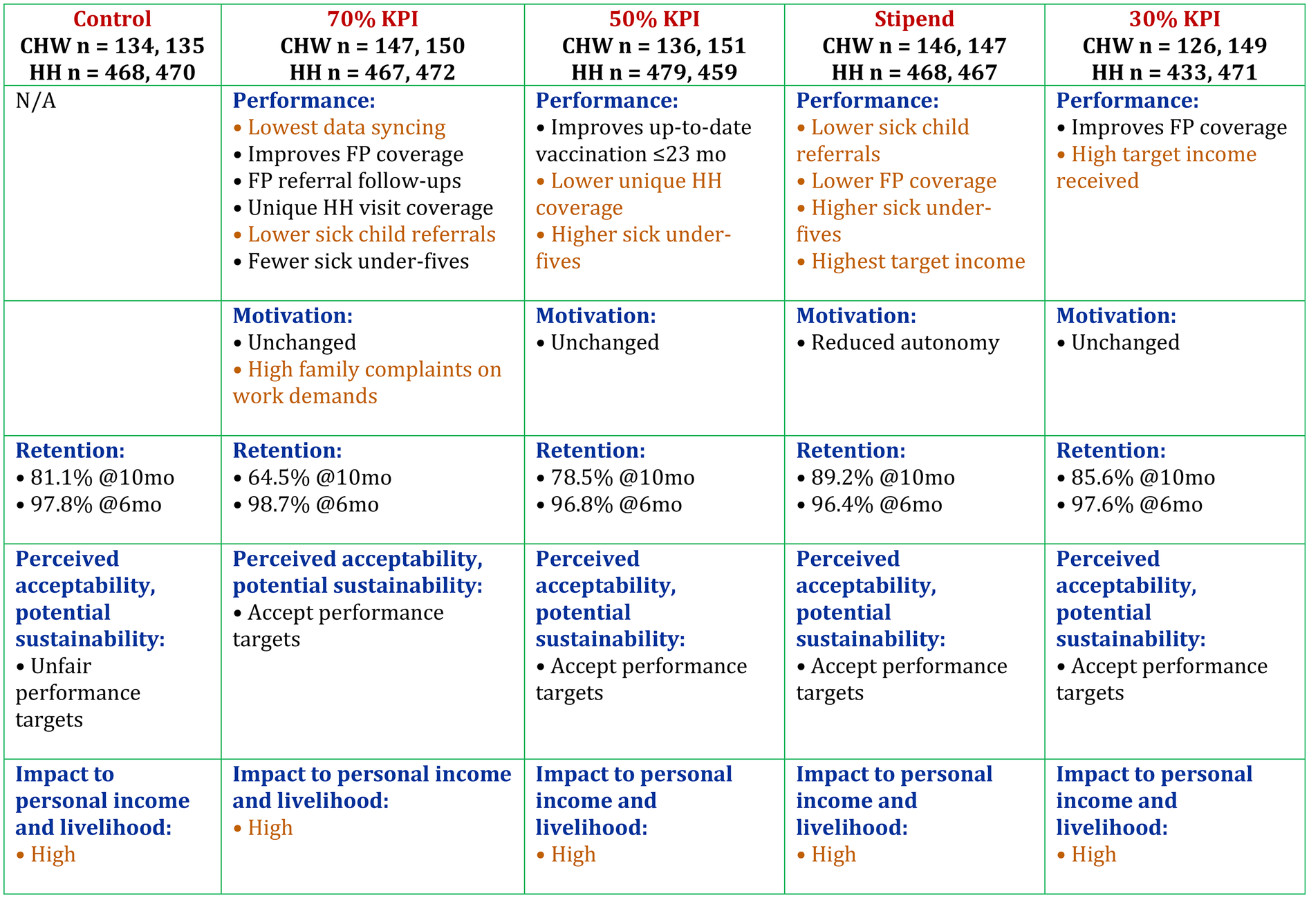 Figure 2 presents a consolidated summary of the key study outcomes across the five compensation arms. It visually compares performance indicators (such as sick-child referrals, household visitation and family-planning follow-up), CHW motivation scores, six- and ten-month retention levels, perceived acceptability and sustainability of performance targets, and the perceived impact of each compensation model on personal income. This figure synthesizes the main quantitative and qualitative findings for each arm, making cross-arm differences easy to interpret.