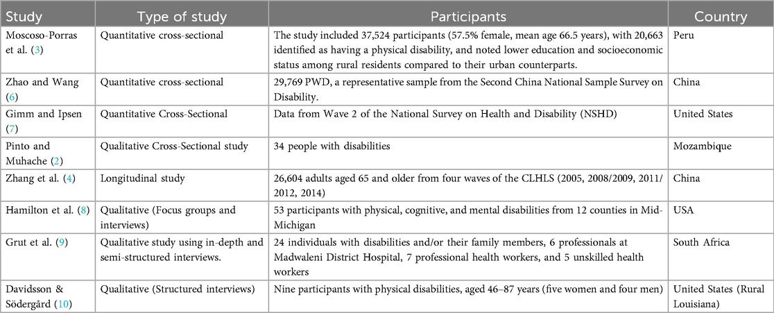 Of the 32 studies selected for full-text review, 24 were excluded after detailed assessment based on the predefined inclusion and exclusion criteria. Eight studies were excluded due to an inappropriate comparator, where the studies compared populations that did not align with the review objectives. Twelve studies were excluded for focusing on an ineligible patient population, such as individuals without documented disabilities or those residing exclusively in institutional care settings rather than community or primary healthcare contexts. Four additional studies were excluded due to a high risk of bias, primarily related to unclear sampling procedures, insufficient methodological transparency, or inadequate reporting of outcomes. Consequently, eight studies met all eligibility criteria and were included in the final synthesis for data extraction and thematic analysis. The characteristics of these included studies are summarized in Table 1, and the full study selection process is detailed in the PRISMA flowchart (Figure 1).