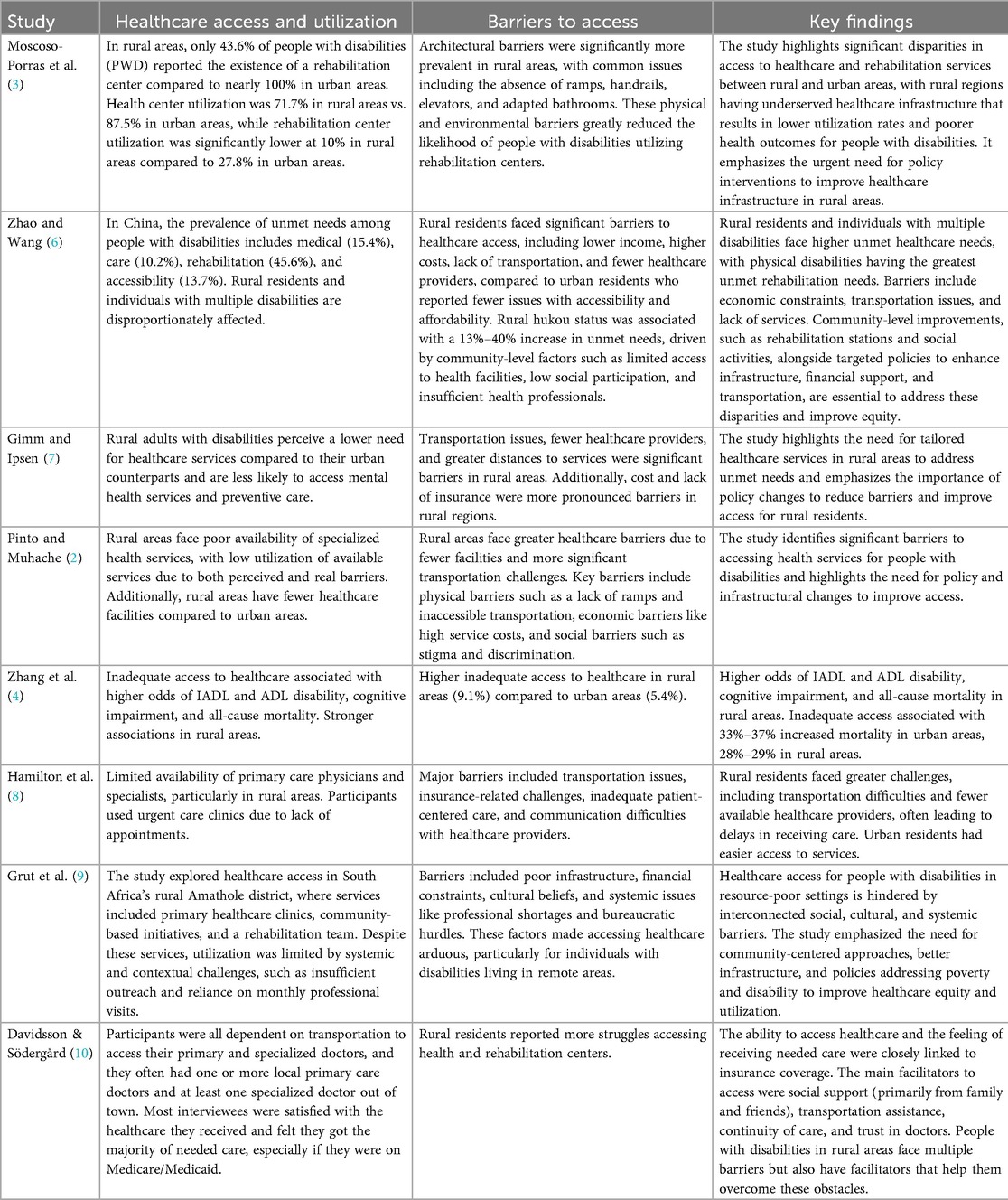 Earlier evidence supports the compounded nature of barriers experienced by people with disabilities in rural settings (16). reviewed 86 studies and found that rural residents with disabilities face unique structural and systemic challenges, including geographic isolation, inadequate healthcare infrastructure, and a shortage of trained professionals capable of addressing disability-related health needs. Local healthcare systems often rely on paraprofessionals, outreach programs, and mobile units to fill service gaps, but these approaches remain limited in scope and sustainability. The authors emphasized the importance of developing and testing alternative delivery models, such as regional centers of specialized care and telemedicine consultations between urban specialists and rural practitioners, to improve access and continuity of care. Their findings underscore that many of the barriers identified nearly three decades ago persist today, highlighting the urgent need for innovative, evidence-based strategies tailored to rural populations with disabilities.