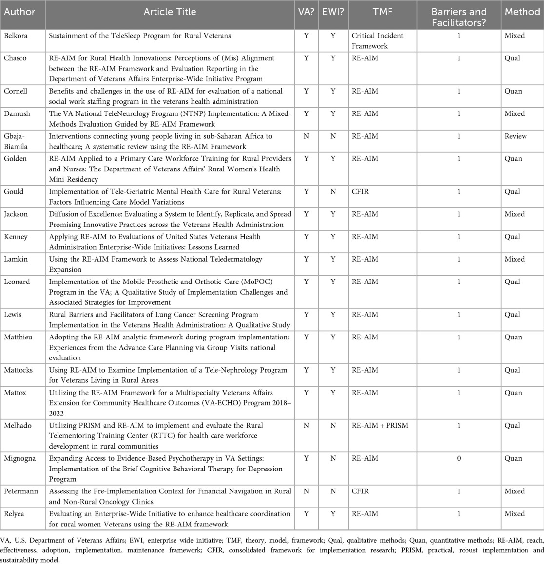 We compiled Table 1 to assist researchers in quickly determining which articles in the compilation could best inform their work. Overall, 15 of the 19 articles applied RE-AIM as their framework, which is not surprising given the focus of the special issue and the number of publications on EWIs (n = 14). One additional publication utilized RE-AIM in the context of the Practical, Robust Implementation and Sustainability Model (PRISM). Two articles applied Consolidated Framework for Implementation Research (CFIR) and one used the Critical Incident Technique as a framework to more fully examine sustainability.