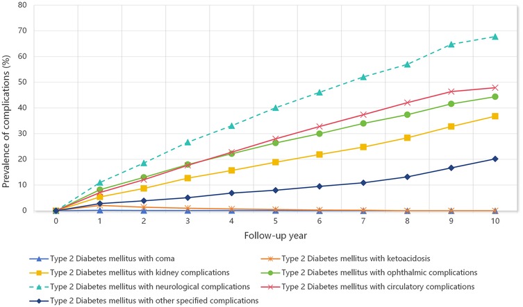 Figure 1. Prevalence trajectories of type 2 diabetes mellitus-related complications over a ten-year follow-up period.