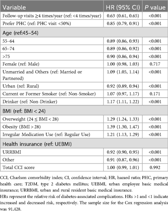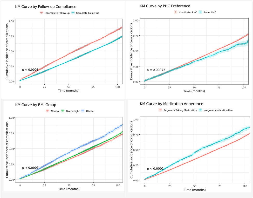 Table 5 summarizes the factors associated with the occurrence of T2DM-related chronic complications based on the Cox regression analysis. Patients with ≥4 follow-up visits per year had a 37% lower risk (HR = 0.63, p < 0.001), and those who preferred PHC had a 15% lower risk (HR = 0.85, p < 0.001) compared with their counterparts. The risk of complications was 17% higher among drinkers (HR = 1.17, p < 0.001), 29% higher among overweight individuals (24 ≤ BMI < 28) (HR = 1.29, p < 0.001), and 39% higher among obese individuals (BMI ≥ 28) (HR = 1.39, p < 0.001). Patients with irregular medication use had a 21% higher risk (HR = 1.21, p < 0.001). Urban residents showed a significantly lower risk compared with rural residents (HR = 0.92, p < 0.001). In addition, age group, marital status, and health insurance type were also significantly associated with the risk of developing T2DM-related chronic complications.
