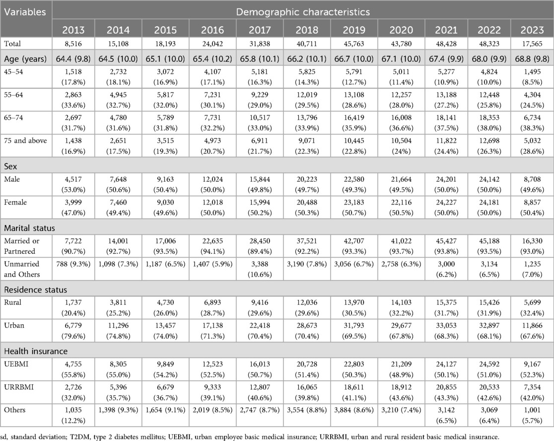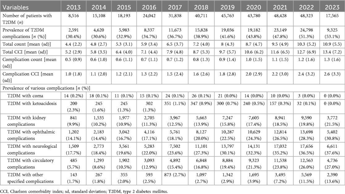 Table 1 presents the demographic characteristics of patients diagnosed with T2DM from 2013 to 2023. The sample size increased significantly, from 8,516 in 2013 to a peak of 48,323 in 2022, then decreased to 17,565 in 2023. The mean age consistently increased across the study period, from 64.4 years (±9.8) in 2013 to 68.8 years (±9.8) in 2023. The proportion of older adults (≥75 years) notably increased from 16.9% in 2013 to 28.6% in 2023. The sex distribution remained relatively balanced, ranging from 49.3% to 53.0% male across the years. A high proportion of patients were married or partnered throughout the period, consistently exceeding 89%. Urban residency was predominant, accounting for 67.6%–79.6% of the sample. Approximately half of the patients consistently held UEBMI throughout the study period, whereas the proportion enrolled in URRBMI steadily increased, reaching 42.0% by 2023. Supplementary Table S2 summarizes the demographic characteristics of the patients diagnosed with T2DM at baseline from 2013 to 2023.