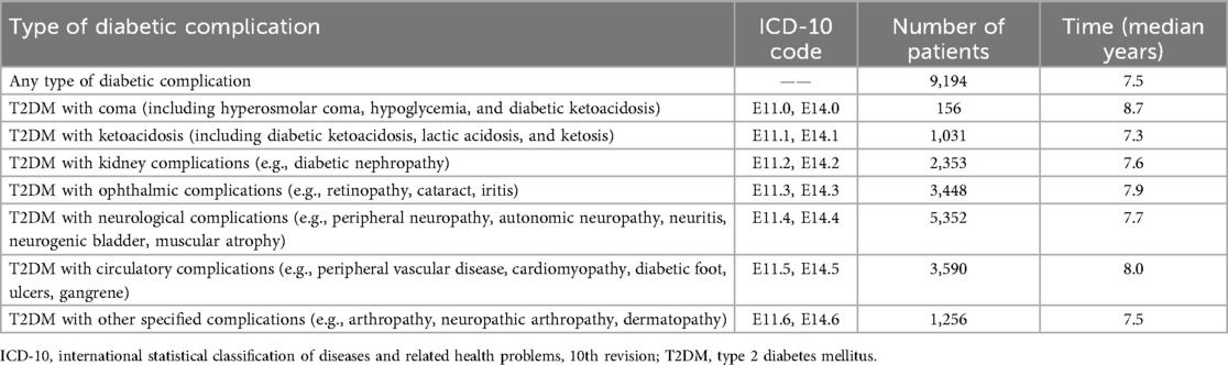 Table 3 presents the median duration from the initial T2DM diagnosis to the onset of various T2DM-related complications. Among the 9,194 patients who developed any complication, the median time to onset was 7.5 years. The time to onset of complications varied across complication types. The longest median duration was observed in patients who developed T2DM with coma (8.7 years), followed by circulatory complications (8.0 years) and ophthalmic complications (7.9 years). In contrast, patients with ketoacidosis experienced complications earlier, with a median duration of 7.3 years. The median onset times of kidney, neurological, and other specified complications were 7.6, 7.7, and 7.5 years, respectively.