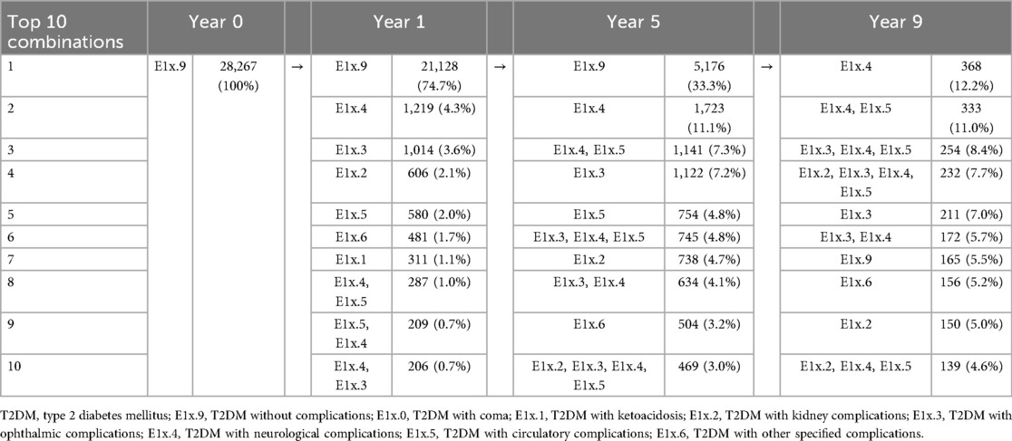 Second, our study provides new insights by revealing distinct trajectories and timings of complication onset that is consistent with prior work emphasizing the importance of early clustering in certain conditions (9). The median time from T2DM diagnosis to the onset of complications was 7.5 years, with notable differences across complication types. Neurological, ophthalmic, and circulatory complications occurred relatively early in the disease course, which echoes the findings of Martinez-De la Torre et al., who reported that specific comorbidity clusters tend to emerge early in the disease course (10). This study also analyzed how combinations of complications evolve throughout the disease course, finding that they become increasingly complex over time, with most patients developing multiple complications by Year 9. The most common patterns was neurological complications alone (12.2%), followed by combinations involving circulatory (11.0%), ophthalmic (8.4%), and kidney complications (7.7%). The growing complexity of comorbid profiles, particularly in Years 5 and 9, underscores the urgent need for personalized and continuous care strategies. Personalized diabetes management, which tailors treatment plans to individual patient characteristics such as age, comorbidities, and lifestyle, improves glycemic control and reduce the risk of complications (39). For instance, the American Diabetes Association and the European Association for the Study of Diabetes advocate individualized glycemic targets to enhance patient outcomes and minimize adverse effects (40). In addition, integrated personalized diabetes management approaches that combine interdisciplinary care and digital technologies have demonstrated promise in addressing the multifaceted needs of patients with T2DM (41).