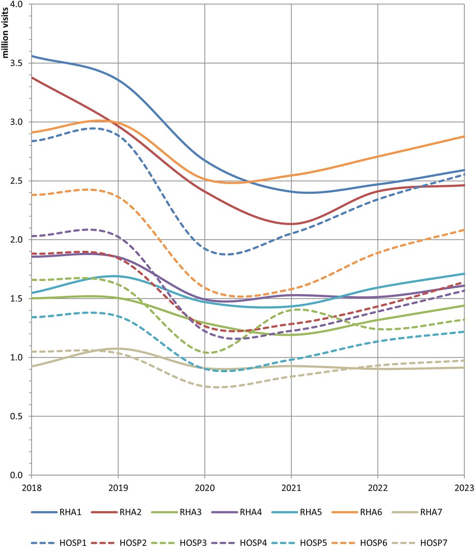 Figure 1. Outpatient visits to RHA units and hospitals, 2018–2023.