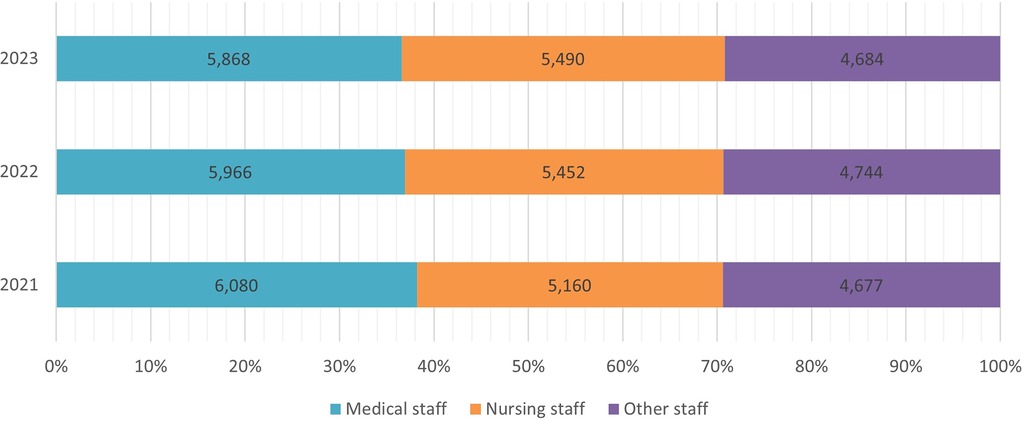 Bar chart comparing medical, nursing, and other staff numbers for 2021 to 2023. Each year shows three segments: medical staff (blue), nursing staff (orange), and other staff (purple). In 2023, there are 5,868 medical, 5,490 nursing, and 4,684 other staff. In 2022, there are 5,966 medical, 5,452 nursing, and 4,744 other staff. In 2021, there are 6,080 medical, 5,160 nursing, and 4,677 other staff. Percentages range from zero to one hundred percent.