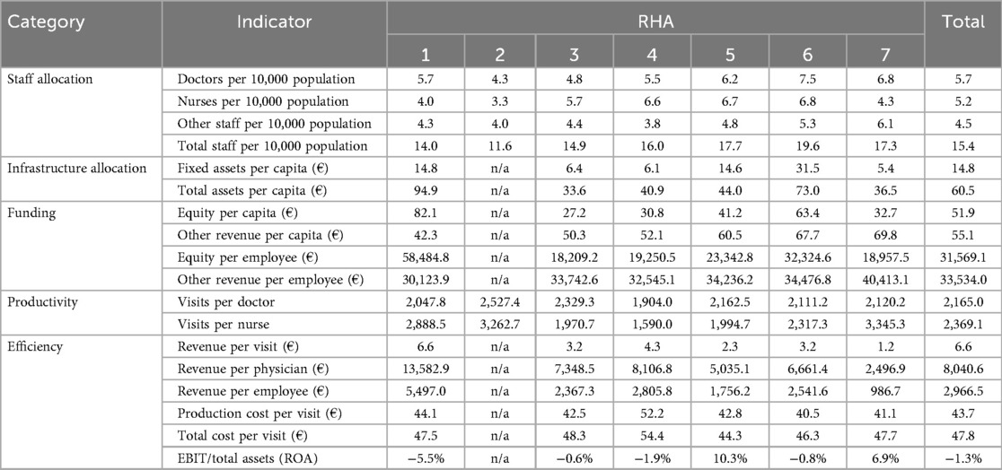 Finally, the analysis focused on 2022 financial and operational indicators to elucidate geographical variations among RHAs. Data availability and the study's objectives guided the selection of indicators, as detailed in Supplementary Table S1. These indicators examine staff and infrastructure allocation, funding, labor productivity, and efficiency.