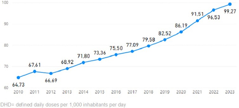 The increase in depression diagnoses has been accompanied by a rise in the prescription of pharmacological treatment. Between 2015 and 2021, there has been an average increase of 15.1 DHD (defined daily doses per 1,000 inhabitants per day) (dayamong OECD countries (25). In Spain, this increase was even more pronounced, reaching up to 19.6 DHD (17). Figure 1 shows the upward trend in the number of DHDs in Spain over the years (26).