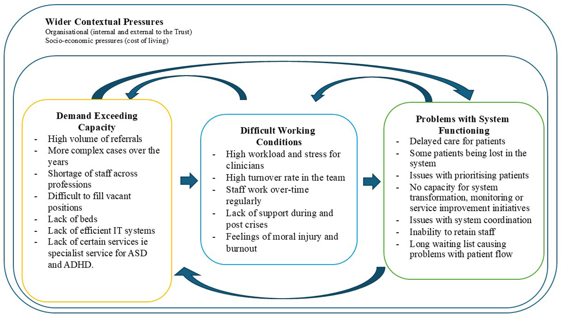 Participants reported rising numbers and severity of patients driven by greater awareness and willingness to seek help. A shortage of skilled staff leads to high caseloads for staff. These pressures lead to more difficult working conditions, which in turn lead to wider problems in the functioning of services (Figure 1). Rising living costs drive turnover and make recruitment, especially to lower bands, difficult. In-patient bed shortages force clinics to manage high-risk patients for longer while they wait for a bed to become available. Closures of specialist services and inadequate IT systems further increase workload. With limited capacity, services prioritise patients with the most serious problems, which means that those with less severe conditions often deteriorate while waiting for care. These pressures affect staff well-being, often leading to burnout, moral injury and long-term sick leave, worsening staff shortages.