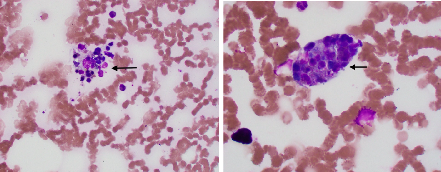 Black arrow showing hemophagocytic cells in bone marrow biopsy.