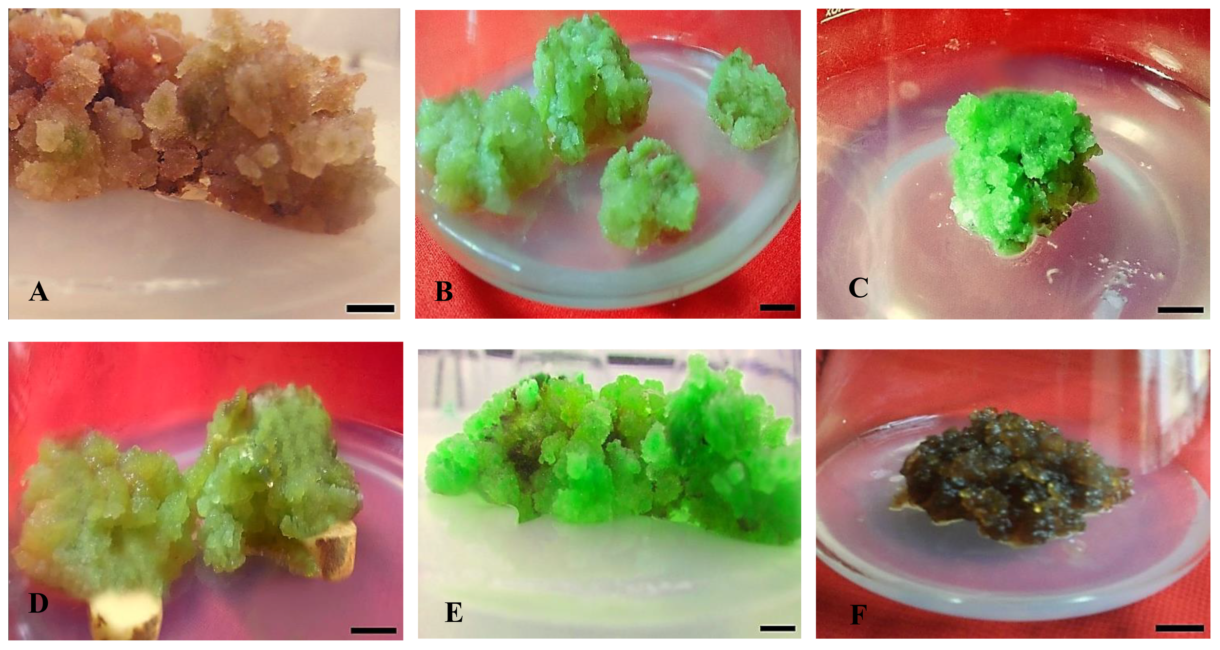 Callus formation, a process driven by physical or chemical stimuli, entails the modulation of natural plant hormone levels, initiating complex regulatory cascades and cellular reprogramming (Tuskan et al., 2018). Callus displays a spectrum of characteristics and can be classified into subgroups based on observable morphological features. In this study, the texture and color of the callus varied depending on the presence and concentration of specific plant growth regulators in the media. Notably, the compact green calli favored shoot development, while the compact dark-brown calli were more suitable for secondary metabolite elicitation (Figure 2). Friable or compact callus typically lacks discernible organ renewal, while rooty, shooty, or embryonic callus exhibits varying degrees of organ regeneration, depending on the specific organs they produce (Ikeuchi et al., 2013).