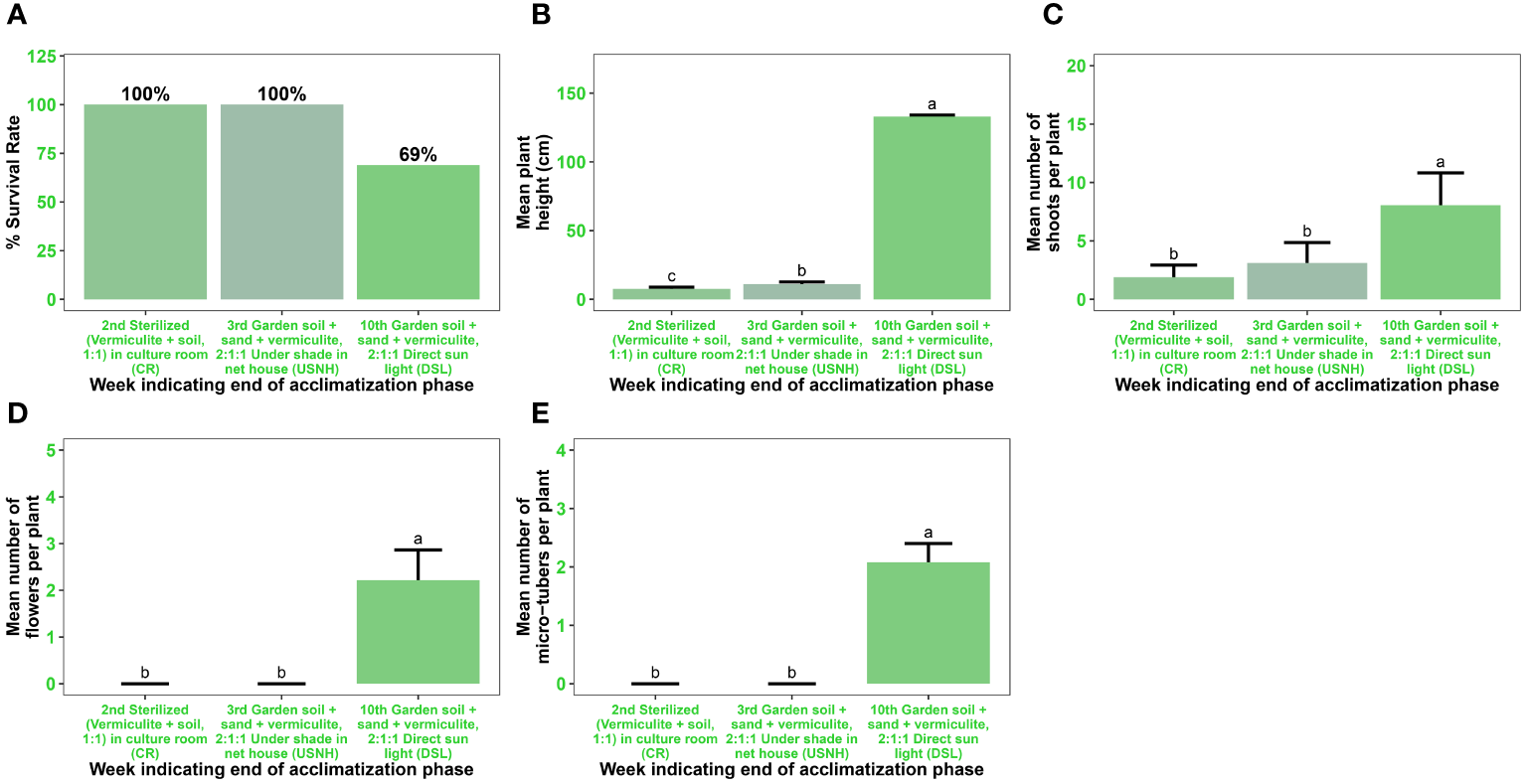 The plantlets were subsequently transferred to larger earthen pots with a diameter of 15 cm. These pots contained a typical mixture of garden soil, sand, and farmyard manure in a ratio of 2 parts soil to 1 part sand to 1 part manure (volume/volume). The pots were exposed to direct sunlight for a period of up to seven weeks, specifically until the 10th week. After the transplantation, the survival rate of the plants outside of their natural environment, their height in centimeters (cm), and the number of shoots, flowers, and microtubers per plant were evaluated. This assessment took place two weeks later in a mixture of sterilized vermiculite and soil in a controlled environment, one week later in a mixture of garden soil, sand, and vermiculite under shade in a protected structure, and seven weeks later in a mixture of standard garden soil, sand, and farmyard manure under direct sunlight.