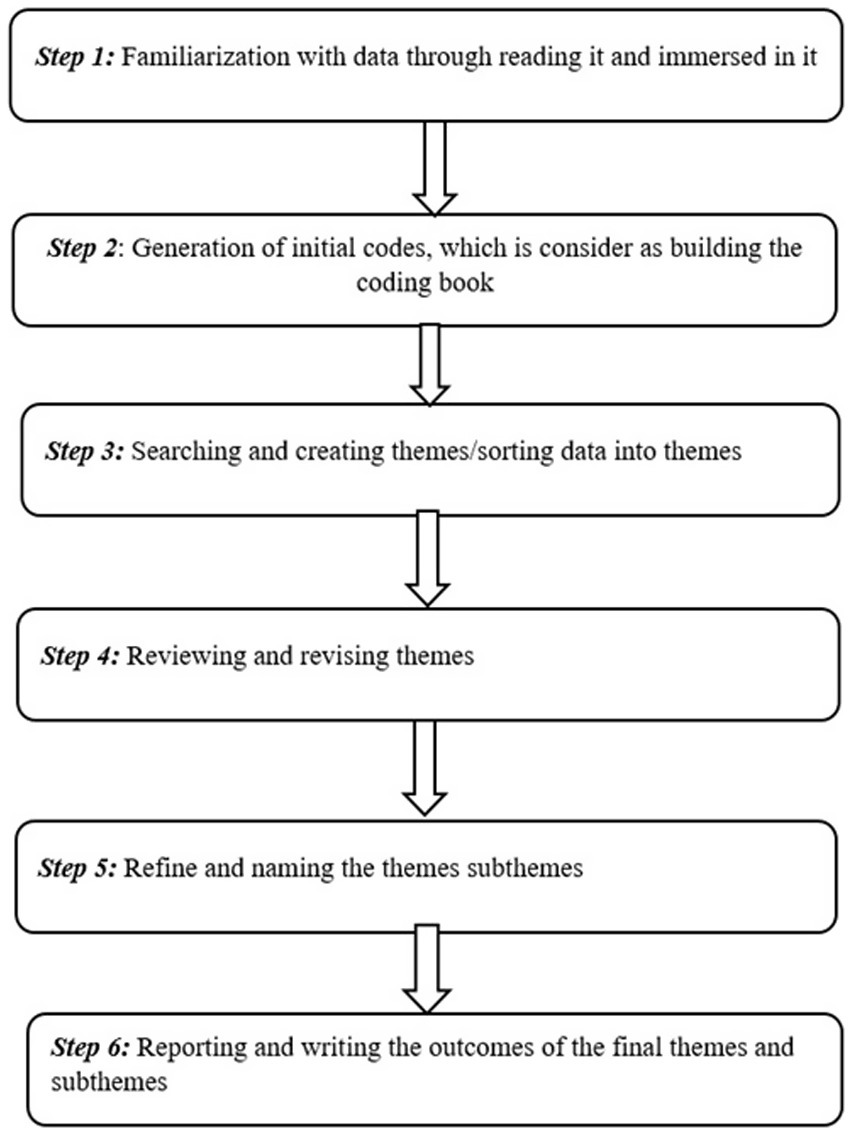 Participants’ responses to semi-structured interview questions are considered as qualitative data utilized to address the research questions. An inductive thematic analysis was conducted to analyze the data following the six-step methodology proposed by Braun and Clarke (2006) (Figure 1). This process involved conducting and recording around 5 h of interviews. Prior to analysis, participant responses were cleaned and organized.