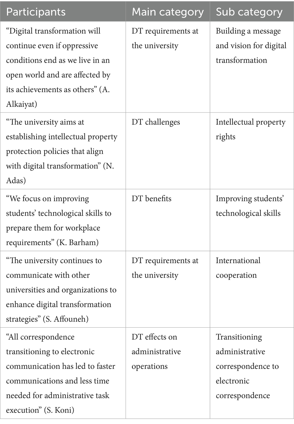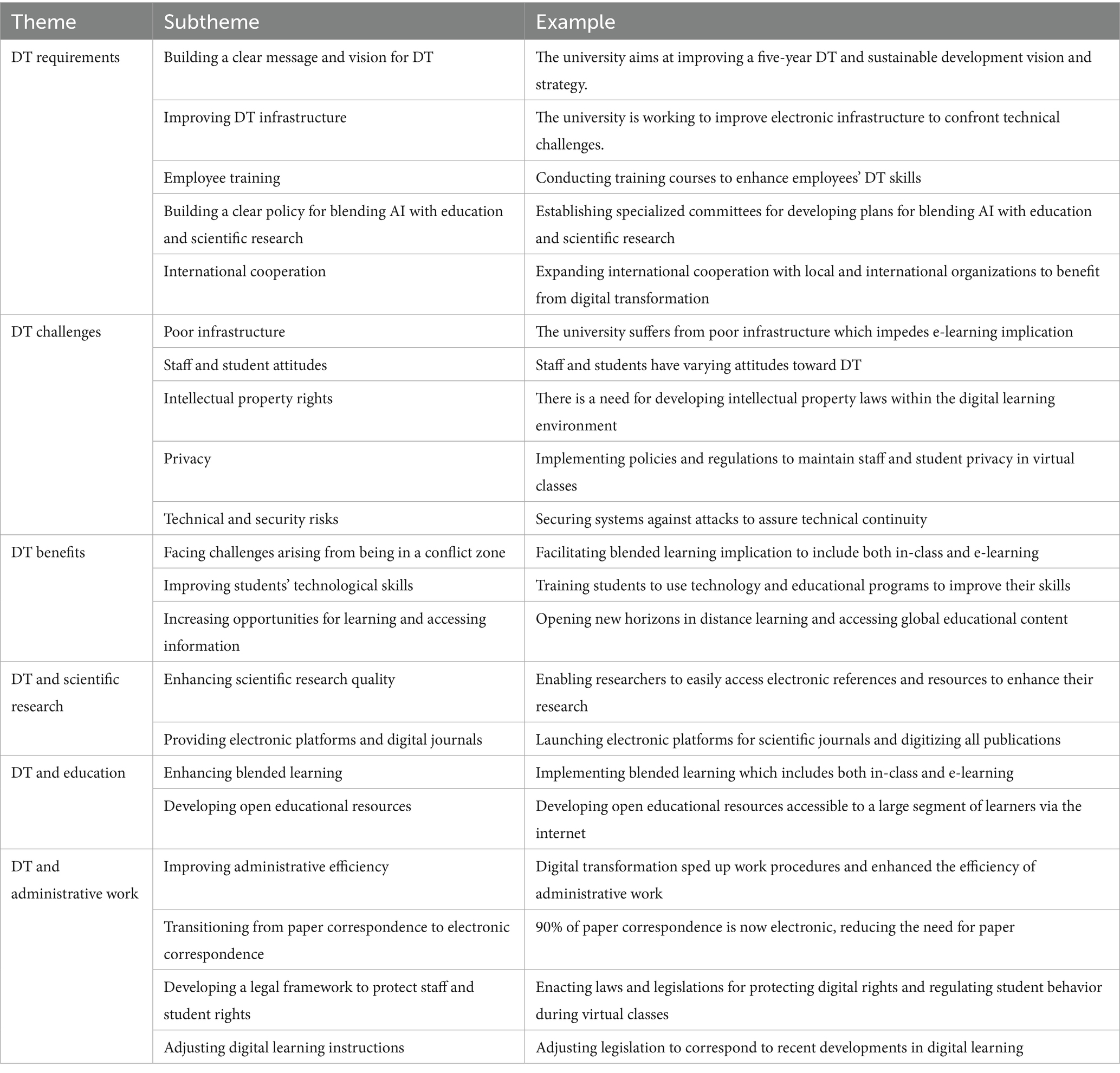 All study participants focused on the importance of adopting DT in higher education institutions, particularly in conflict zones. The qualitative data was analyzed and divided into seven main categories including DT requirements, DT challenges, benefits of DT particularly in conflict zones, DT and scientific research, and DT and administrative work. Each category included a number of subcategories which the participants referred to in the individual interviews. The following will provide a detailed explanation of the results.