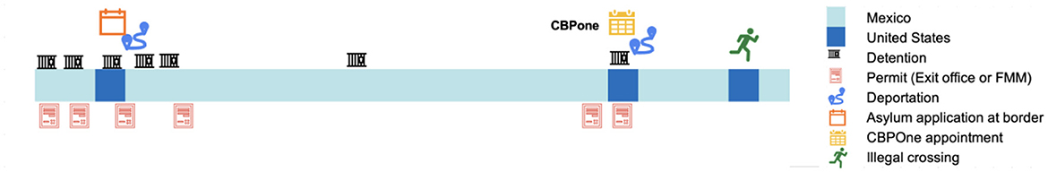 The various strategies migrants pursue in order to reach the United States are reflected in Felipe's journey. He made three attempts to cross into the U.S. (Figure 3, dark blue), with the last one being successful.