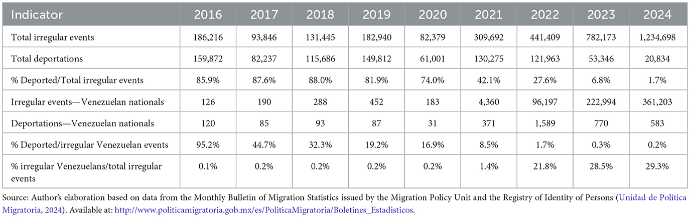 Table 1. Irregular migrant events and deportations in Mexico (2016–2024): total and Venezuelan cases.