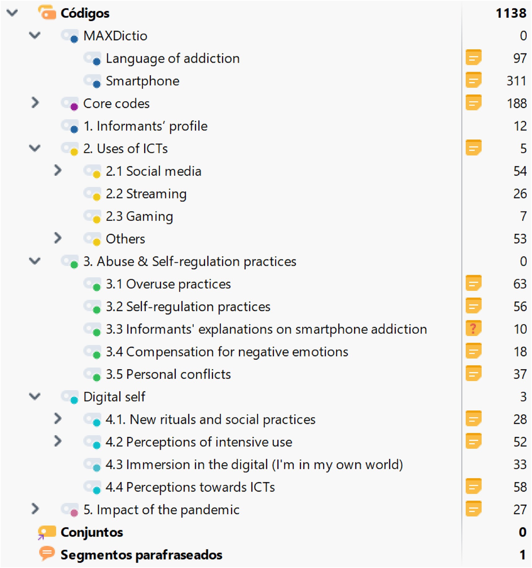 A thematic analysis was performed to identify recurring patterns of meaning across the data (Braun and Clarke, 2006), using a step-by-step process involving transcription, coding and conceptualisation (Naeem et al., 2023). The qualitative data were analysed using the MaxQDA software (version 4.01.2022). The analysis was structured as follows: exploration, text coding and relativisation (Taylor and Bogdan, 1998; Strauss, 1987). The coding system is the result of the joint work of the authors of this study (Kuckartz, 2014) and began in the form of broad content codes when a small sample of interviews was analysed. Codes such as self-regulation practices and perceptions towards ICTs proved to be of fundamental importance to the research. The former includes 56 coded fragments collected from 24 interviews (100% of the sample). The latter sums 58 coded fragments collected from 23 interviews (95.8% of the sample). In the narratives about the everyday use of ICTs, self-regulation strategies emerge as a significant code. The informants were mainly concerned about the use of smartphones and described experiences and feelings of abuse when they are online. The code ‘perception of ICTs’ has a cross-cutting nature, as the informants can reflect either on the design of ICTs and their impact on people’s lives. The topics raised by the informants were addiction to ICTs, social media, personal feelings while online, conflicts between online and offline life, and social practices. Other significant codes initially established were overuse practices (63 coded fragments from 20 interviews, 83.3% of the sample), social media (54 coded fragments from 19 interviews, 79.2% of the sample) or the individual’s perceptions of intensive use (52 coded fragments from 10 interviews, 41.7% of the sample).