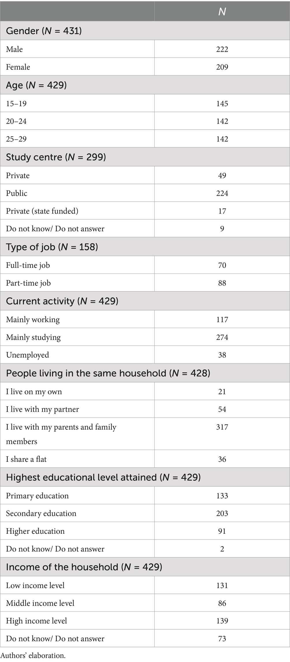 The empirical data is drawn from a research project carried out between 2019 and 2022 that focuses on young people’s use of ICTs from a social and cultural point of view. Quantitative and qualitative methods were both used. A total of 431 questionnaires were distributed and only individuals aged between 15 and 29 years were included in the study. This age criterion conforms to international definitions and current research on youth (Xi, 2016). The survey fieldwork was conducted in Murcia, the capital city of a south-eastern Spanish region during the COVID-19 pandemic. Informants were approached on the street and encouraged to complete a self-administered questionnaire supervised by an interviewer. The choice of this strategy in the context of the pandemic resulted in a low response rate and a lengthy fieldwork (from December 2020 to February 2021). The freedom of movement and the gathering of groups in public spaces were both restricted. The sampling process was adapted to the distribution of the target group according to the Padrón Municipal de Habitantes (Local Population Register) and was completed when the initial quota by sex/age/ neighbourhood of residence were covered. Another sampling criterion was that the sample should not exceed the quota for foreign residents and the unemployed. In general, the sampling was adjusted to fit the quotas. However, the quotas for some small rural areas were not fully met (19 cases in total). One in 10 questionnaires collected by each interviewer were supervised by telephone. As a result of a review process, 20 questionnaires were rejected. The questionnaire was structured in three blocks: (1) Questions on the use of ICTs. (2) The Compulsive Internet Use Scale (CIUS), selected as it has been recognised by academics and applied in different forms and languages to measure the problematic use of the Internet (Lopez-Fernandez et al., 2019). (3) Socio-demographic questions. In order to ensure data comparability, some questionnaire items were based on studies carried out by Spanish research centres, such as the Reina Sofía Centre for Adolescence and Youth, the Observatory for Drugs and Drug Addiction or the Sociological Research Centre. The sociodemographic profile of the informants is outlined in Table 1.