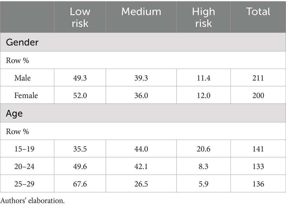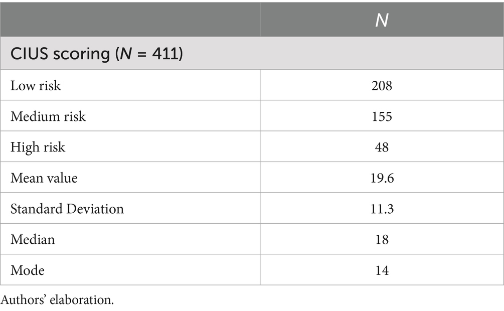 The quantitative analysis carried out in this study focuses on those items that explore the perception of respondents of ICT use and how they manage their use when they perceive it as detrimental. Moreover, the sample has been classified according to the scores collected to the CIUS scale (Table 2). This scale consists of 14 items on a 5-point Likert scale, from (0) Never to (4) Very often (producing a final score ranging from 0 to 56). It has been reported good stability across different samples and high internal consistency of the instrument (Meerkerk et al., 2009). The CIUS asks respondents whether they can control their Internet use and how it affects their mood and daily activities. According to youth surveys conducted by the Spanish National Plan on Drugs, a risk of compulsive use of the Internet is observed when participants score 28 points or higher. Instead of using a dichotomic category, three main groups were stablished according to the scores obtained. In line with other researchers that analysed CIUS results in several categories, this strategy aims to distinguish extreme groups (high/low score informants) within the sample. Díaz and Gómez-Torres (2019) use the following distribution to assess problematic internet use among secondary school students (Low Risk: CIUS<19, Risk: CIUS >18 AND <28, High Risk: CIUS = or > 28, and Very High Risk: IDQ = 0 > 5). Yong et al. (2017) establish three categories: 0–18; 19–37; 38–56. In this study, the high-risk group is composed by the interviewees who scored more than 34 (this value is the median from 28 and the highest score obtained, 54). The medium-risk group includes individuals scoring between 19 and 34. Finally, the low-risk group is composed of informants scoring between 0 and 18. A high level of response to the 14 CIUS scale items was collected within the sample under study (99–100% of cases). Table 2 shows the CIUS scores of the respondents while Table 3 shows the profile of the CIUS groups by gender and age.