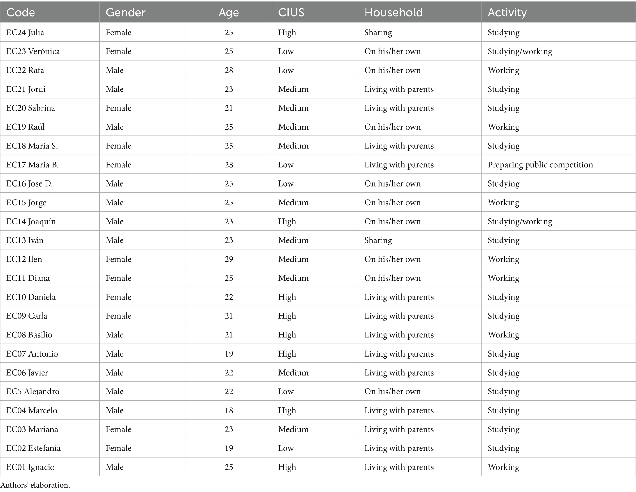 At the end of the questionnaire respondents were asked to participate in the interview phase of the research. Even though nearly one quarter of respondents wrote down their contact information, the rate of volunteers was low. This could be due to several reasons, such as lack of remuneration, the post-pandemic context, or the time elapsed since the fieldwork. As a result of this process, 15 of the 24 interviews were obtained, and the rest of the sample was contacted by a snowball procedure with the interviewees. A call was also made via social media. The last group also completed the questionnaire. Most of the interviews were conducted face-to-face, and some interviews were conducted by videoconference at the request of the interviewees. The in-depth interviews were mainly concerned with the informants’ everyday use of ICTs and their perceptions of ICTs and their own use. Ethical approval for this study was obtained from the UCAM Ethics Committee (approval number CE072204). All the participants gave their informed consent to participate in the research. Table 4 describes the sample interviewed.