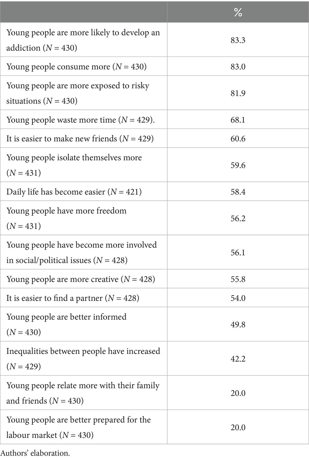 Within youth studies, literature focuses on ICTs to explain their culture (Feixa et al., 2016). Having grown up in a digital culture (Tapscott, 2008), they are said to share a significant cultural framework, defined by virtual time/simultaneity, mobility across social identities and spaces and the network as a social structure for socialisation (Feixa, 2014). In fact, there is a well stablished body of literature that analyses youth perceptions. Broadly speaking, research shows that young people share an ambivalent discourse when assessing the role played by ICTs in society and in their daily life. Their narratives mix both positive and negative views. In this vein, discourses of freedom and of necessity have been observed (Calderón Gómez, 2021). Youth online attitudes are defined as complex, in terms of a constant controversy between balancing opportunity and risk (Gaspard, 2020).