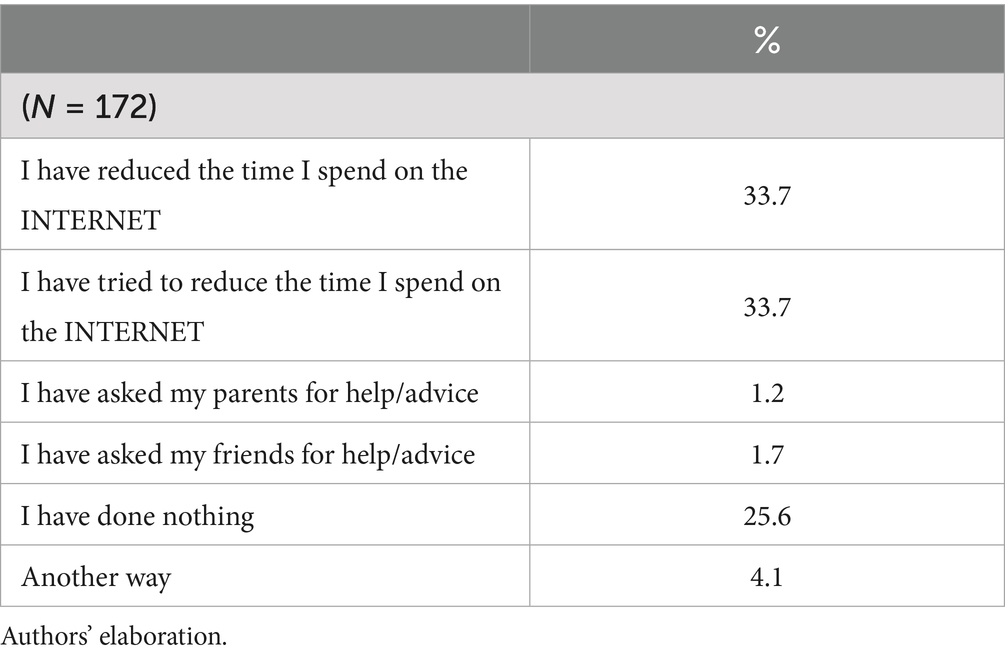 Additionally, the questionnaire asked informants to report whether their use of the internet for fun had increased during the COVID-19 pandemic. There were 332 valid cases that answered affirmatively (77.4%) and four out of 10 in this group (172 valid cases) stated that they felt that such use was detrimental to them. Table 6 shows how informants behave in response to this perception. Survey data show a mixed picture, since the responses obtained were equally distributed: those who reduce the time they spend on the Internet (33.7%), those who simply try to do so (33.7%), and those who do nothing (25.6%). A small group of interviewees stated that they had asked friends (1.7%) or their parents (1.2%) for help/advice, leaving them in the minority. None of the respondents declared that they had sought professional help.