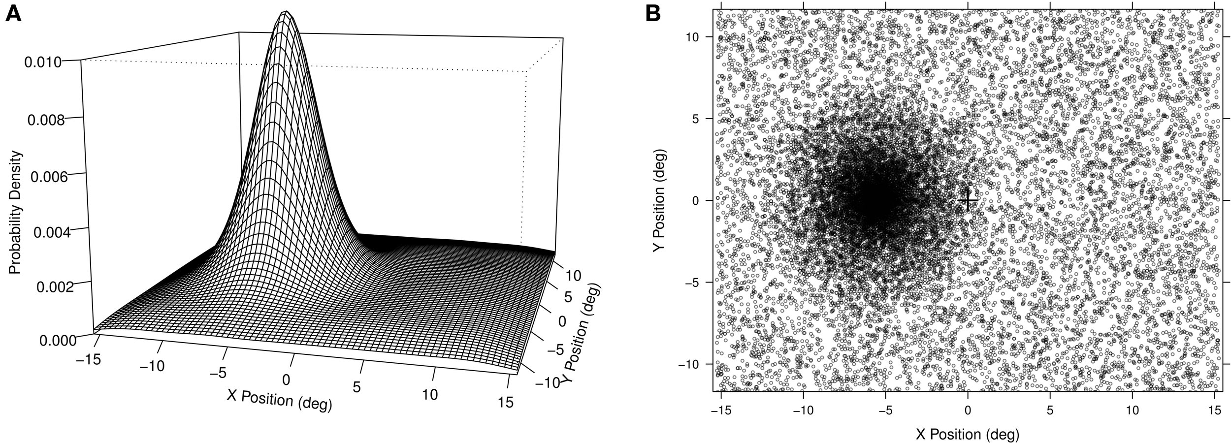 (A) Left: The probability distribution for the left sided hotspot distribution is shown. The screen dimensions were 31° × 24° of visual angle and the center of the hotspot distribution was offset 5.6° to the left. The distribution had a linear decrease over a radius of 7.3° at which point it blended in to a background uniform probability. (B) Right: The actual experimental distribution collapsed across all 12 participants. Each point indicates the location of one trial for one participant. Note that for half of the participants the hotspot was actually on the right side, but we have reflected the data here to aid visualization.