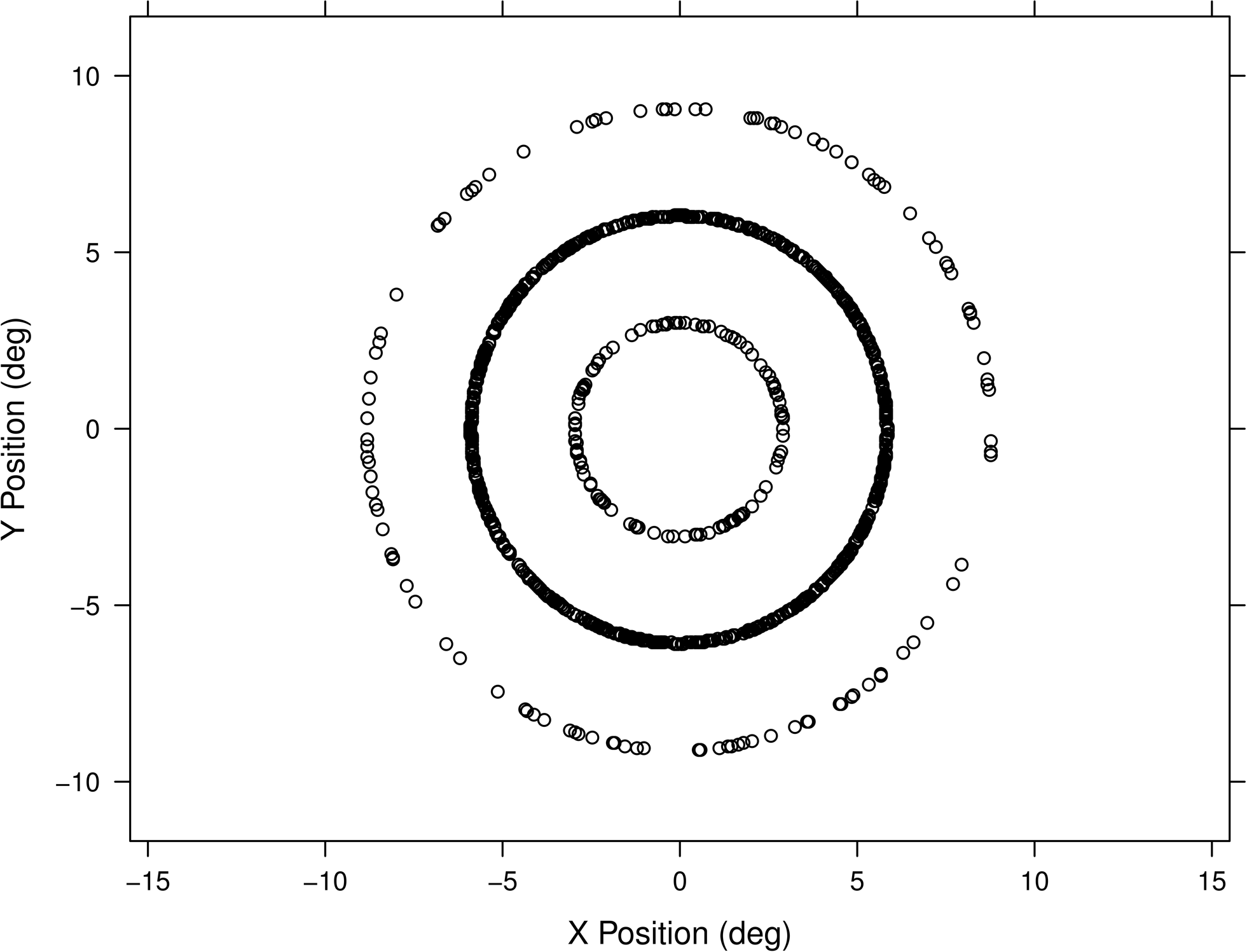 Stimuli in Experiment 2 were located in concentric circles at 3°, 6°, and 9° of visual angle from fixation, with one circle containing 80% of stimuli and the other two containing 10% each. Plotted here is the full set of stimulus locations for one participant in the middle-heavy condition. Five centimeters near fixation subtended just over 4° of visual angle.